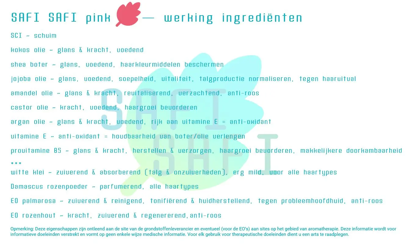 opmerking: allergenen in essentiële oliën safi safi pink (geraniol, linalool, terpineol, beta-caryophyllene, geranyl acetate) zijn van natuurlijke origine en niet synthetisch